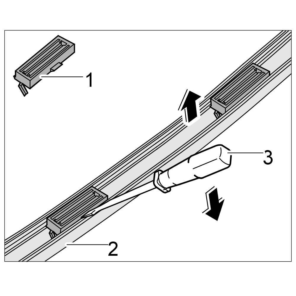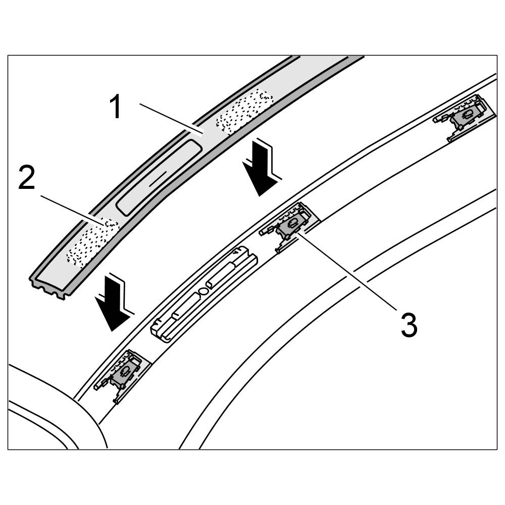 3. Position the roof joint strip -1- on the roof channel, and align the roof joint clips -2- in the roof joint cover strip with the spreaders -3- so that they lie directly above one another.