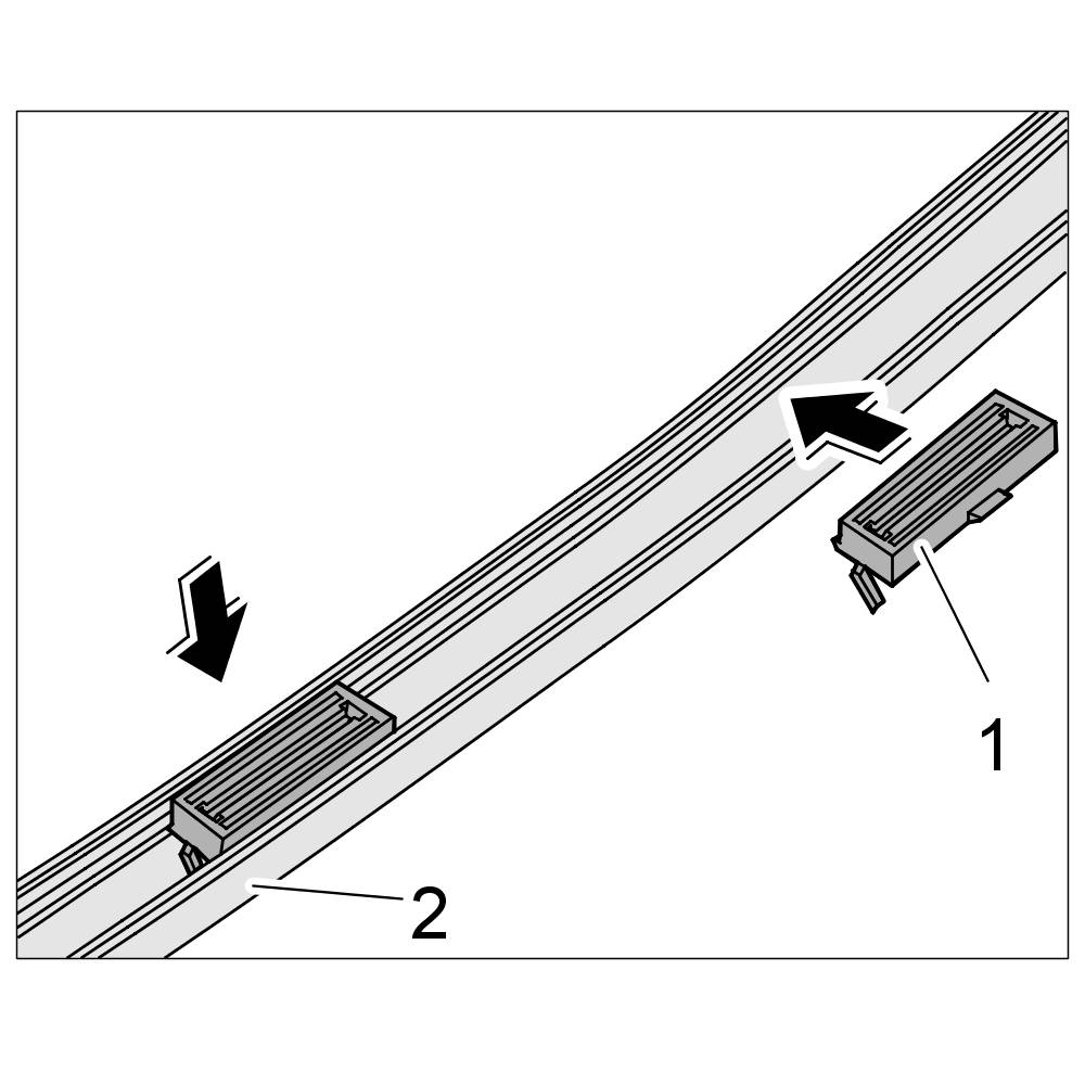 1. Insert roof joint clips -1- narrow side first, and press in until the locking tab in the roof joint cover strip -2- engages.