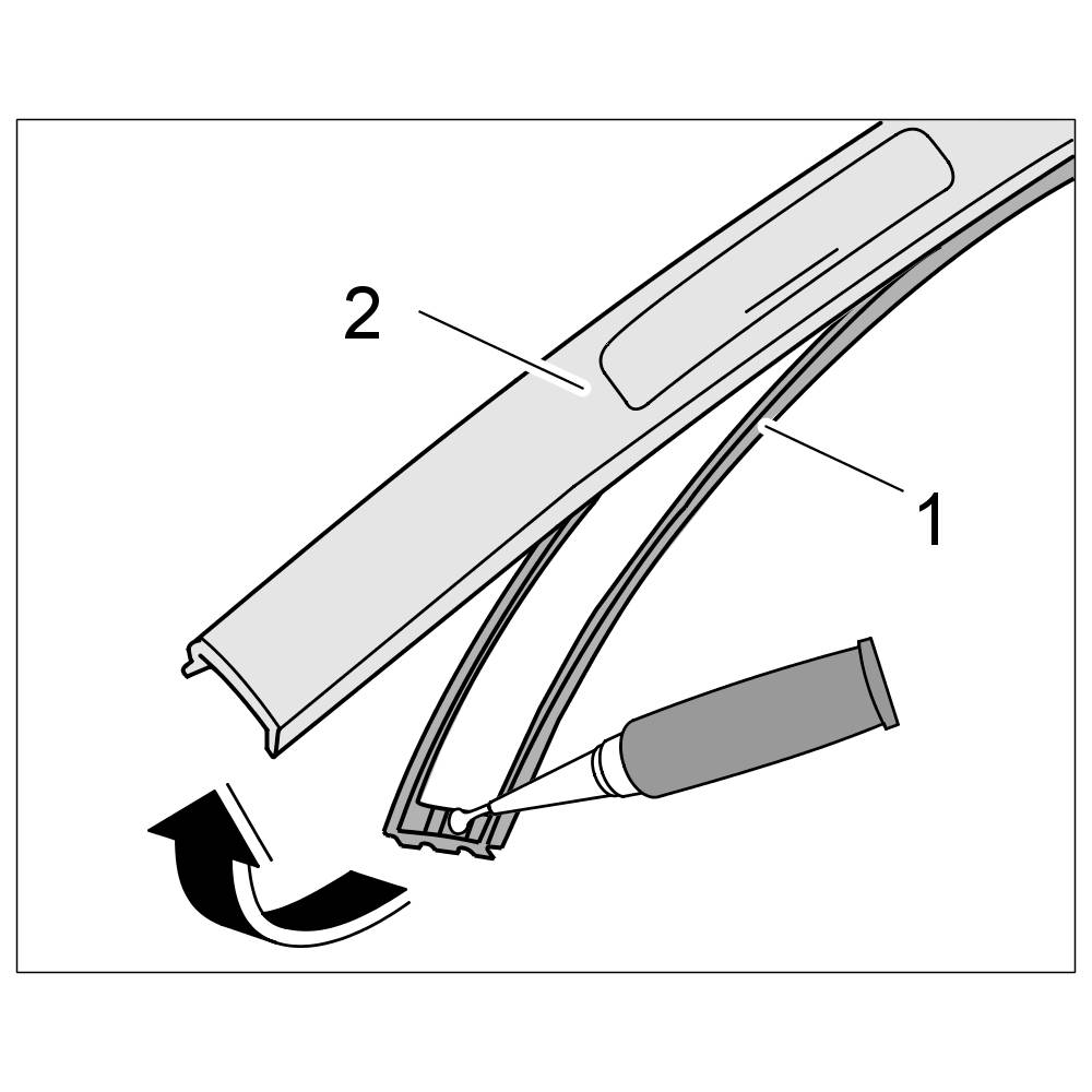 3. Stick in the roof frame seal -1- at the ends of the roof joint cover strip -2- using Loctite 241 WE .
