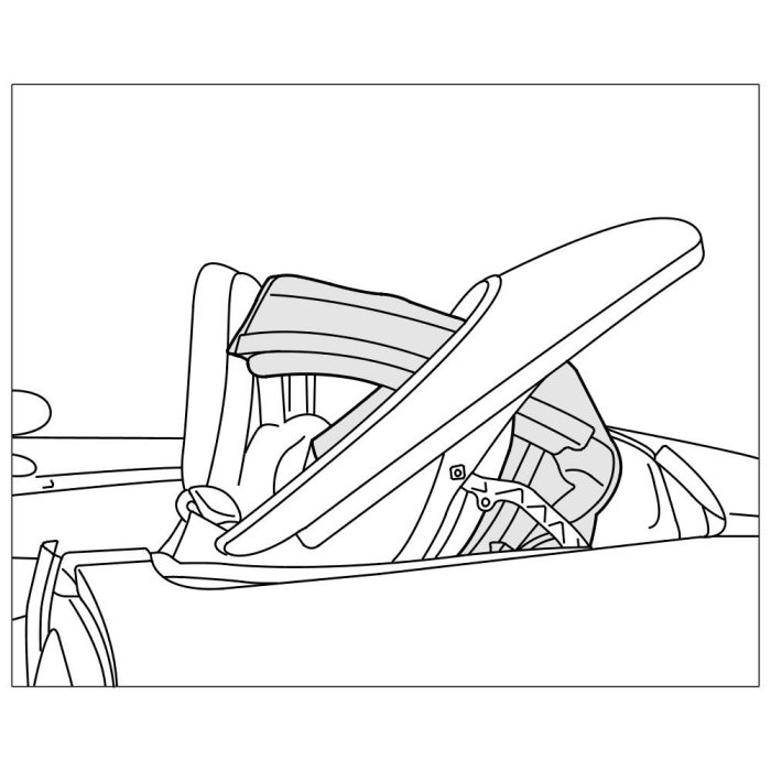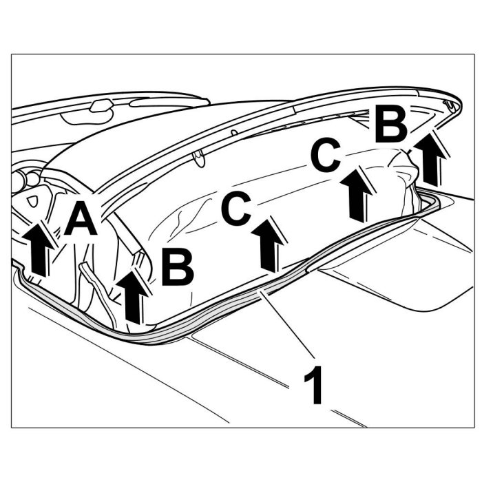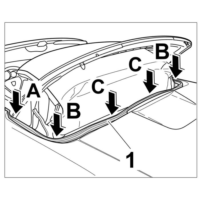 1. Lay seal for convertible top compartment lid -1- evenly along the flange. Position and press the seal without any tension on the flanges to the side panel -Arrow A- , corner pieces -Arrow B- and to the engine compartment bulkhead -Arrow C-.