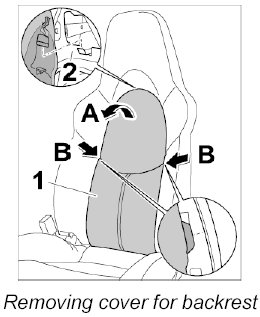 2. Insert your hand into the top of the backrest cover -1- and disengage it by pulling it up out of the backrest frame -2- ( -arrow A- ). Then press cover for backrest together slightly in the middle -arrows B- and pull forwards and out.