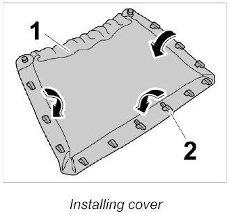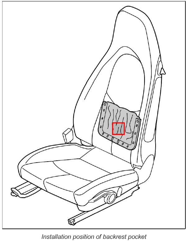 Engage cover for backrest pocket -1- in the plastic frame -2- all the way round.