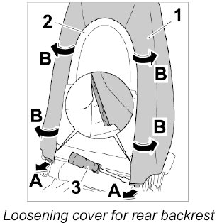 7. Press out cover for backrest -1- from the cushion carrier -2- lower left and right using a screwdriver -3- -Arrows A-.