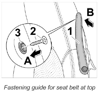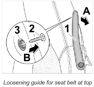 5. Press seat-belt guide -1- into push button -3- at top -Arrow B-.