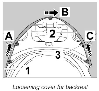 4. Push out plastic strip -2- on cover for backrest -1- from the fixing clips -3- in direction of arrow -A, B, C-.