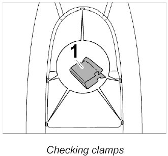 11. Press cover for backrest -1- into the cushion carrier -2- lower left and right using a plastic wedge -3-.