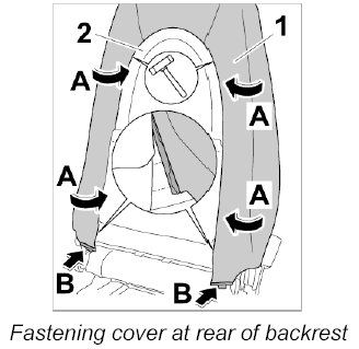 8. Pull out cover for backrest -1- all around by hand from the rear of the cushion carrier -2- -Arrows B-.