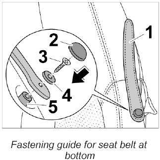 1. Position seat-belt guide -1- with sleeve -5- with the aid of the marking on the backrest cover.