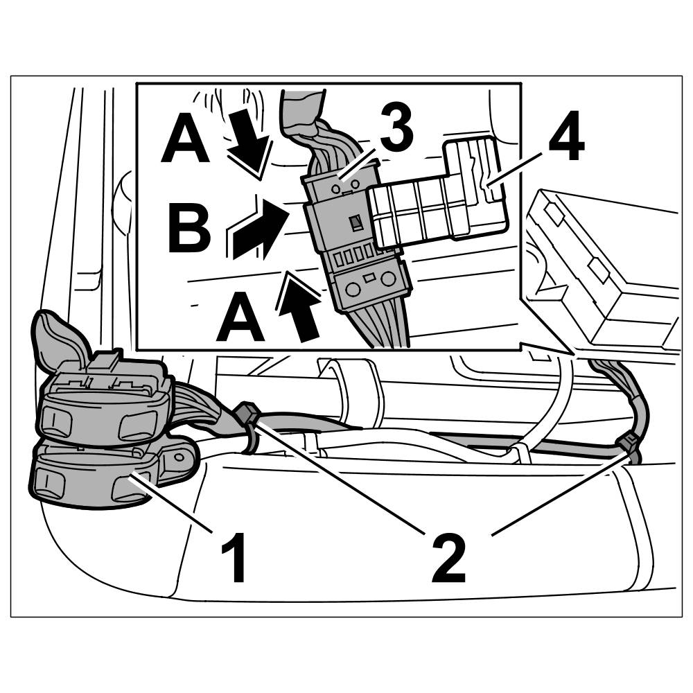 2. Push plug connection -3- into holder -4- ( -arrow B- ).