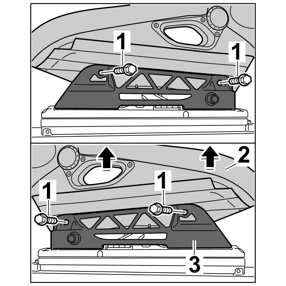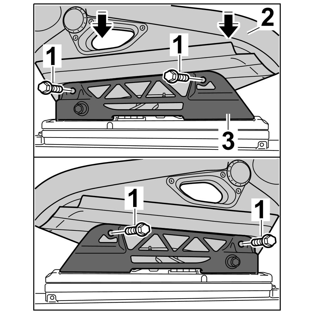 1. Position the seat shell -2- on the bracket -3- ( -arrows- ) and secure with the fastening screws -1- at the left and right. => Tightening torque: 24 Nm (18 ftlb.)+3 Nm (+2 ftlb.)