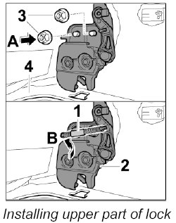 1.4. Engage the tension spring -1- at the upper part of the lock -2- ( -arrow B- ).