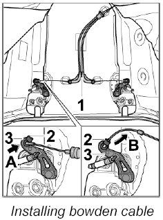 2.2. Swivel the bowden cable -1- 90 degrees and engage it in the locking clip -2- ( -arrow B- ).