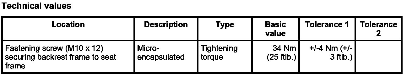 1. Fit backrest frame -2- into the seat frame, position it correctly and secure with the fastening screws -1-. Tightening torque Tightening torque: 34 Nm (25 ftlb.) ± 4 Nm ( ± 3 ftlb.)