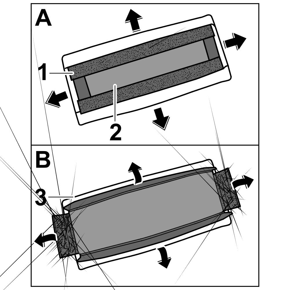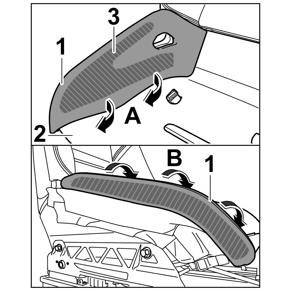 3. Press on padding -1- in the bonding area -3- of the seat shell -2- ( -arrows B- ).