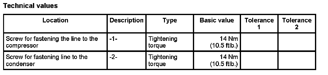 2. Insert compressor-condenser line into the line to the compressor and fasten with the fastening screw -2-. - Tightening torque: 14 Nm (10.5 ft. lbs.)