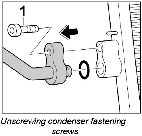 1. Unscrew the fastening screw -1- for the condenser line and pull the line out of the condenser.