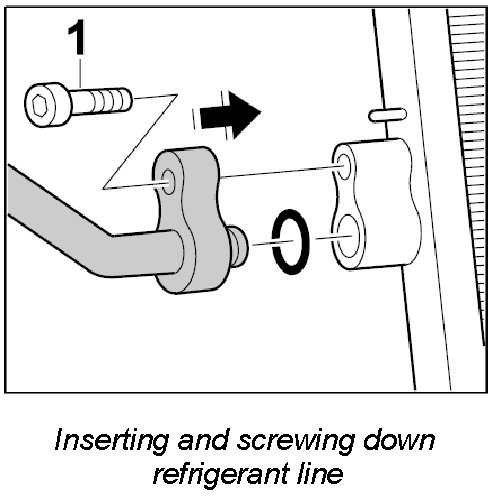 4. Insert compressor-condensor line into the condenser and fasten it with the fastening screw -1-. - Tightening torque: 14 Nm (10.5 ft. lbs.)