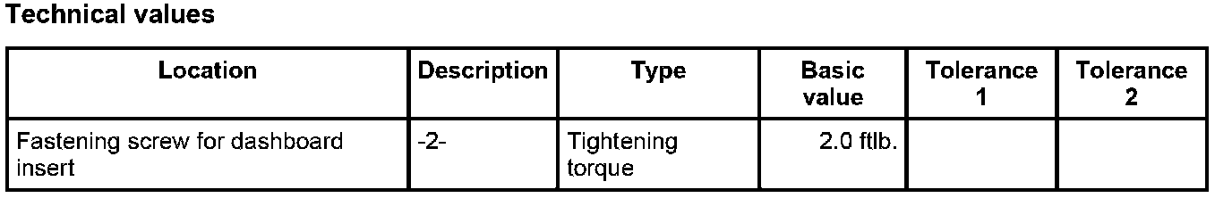 1. Position dashboard insert -1- on the dashboard and screw into place with the seven fastening screws -2-. - Tightening torque: 2.0 ft. lbs.