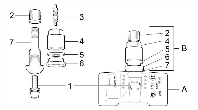 1. Loosely fit the wheel electronics unit -A- at the valve -7- (do not tighten screw -1- ). Insert this assembly into the valve bore (of the rim) with the bead seat sealing ring -6-.