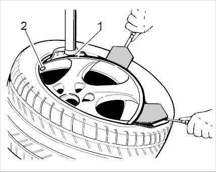 ^ Before removal/mounting, it is important to establish whether a Tire Pressure Monitoring system (TPM) is fitted! The tire valve serves as the distinguishing feature. Without TPM: rubber valve. With TPM: aluminum valve. If a TPM system is fitted, read the special information on the Tire Pressure Monitoring system (see module in this main chapter).