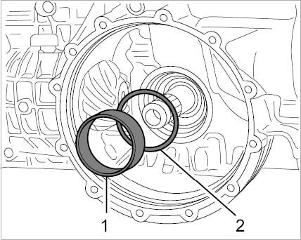 1. Remove outer bearing ring -1- and adjusting shim -2- from the transmission housing by hand.