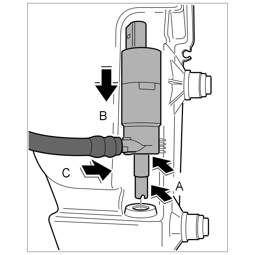 2. Apply a suitable rubber lubricant (tyre mounting paste) to the sealing surface -arrows A- and press the pump for the windscreen washer system into the rubber seal -arrow B- until it is felt to engage.