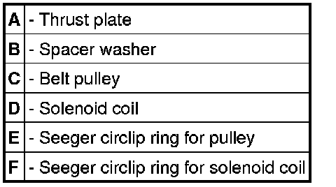 7. Remove Seeger circlip ring -F- for the solenoid coil with the Seeger circlip ring pliers. Remove the magnetic coil from the compressor housing.
