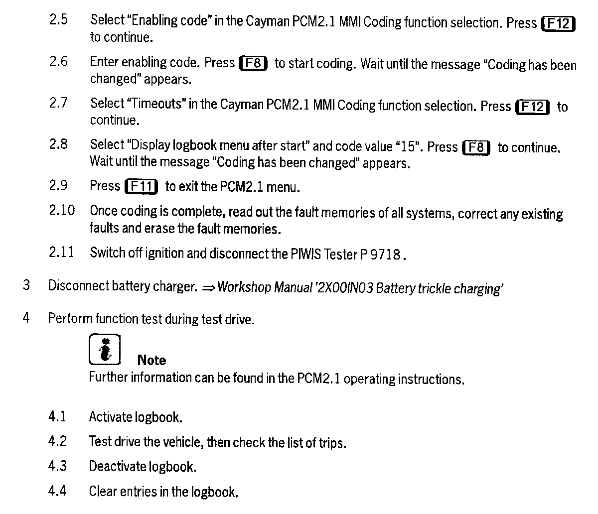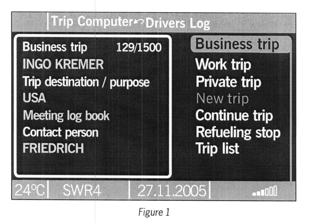 The PCM2.1 logbook supports the driver in maintaining a logbook by recording all relevant data for the type of trip (private, business), much of it automatically, and reducing user input to a minimum. PCM2.1 automatically records every trip covering a distance > 100 miles. Trip recording starts as soon as the key is inserted in the ignition and ends when it is removed. PCM2.1 will automatically record the following data:
