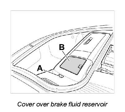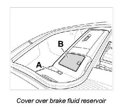 1. Disengage and remove cover over brake fluid reservoir -B-.