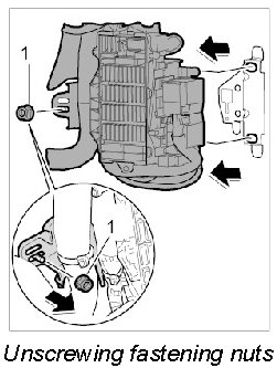 2. Unscrew the fastening nuts -1-, pull the fusebox forward and disengage it from the support.