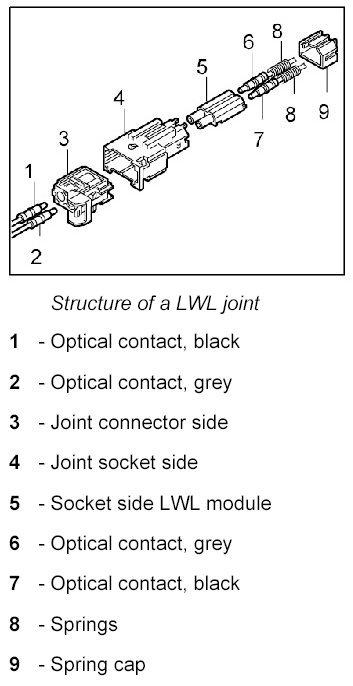 The LWL is delivered with affixed plastic contacts. These contacts are latched in the connector housing in the case of repairs. Grey and black contacts with identical mechanical dimensions are used.