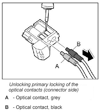 2. Release the connectors of the damaged optical waveguides on the affected components -Arrow a- and disconnect them. The illustration shows the connector on the CD changer as an example.