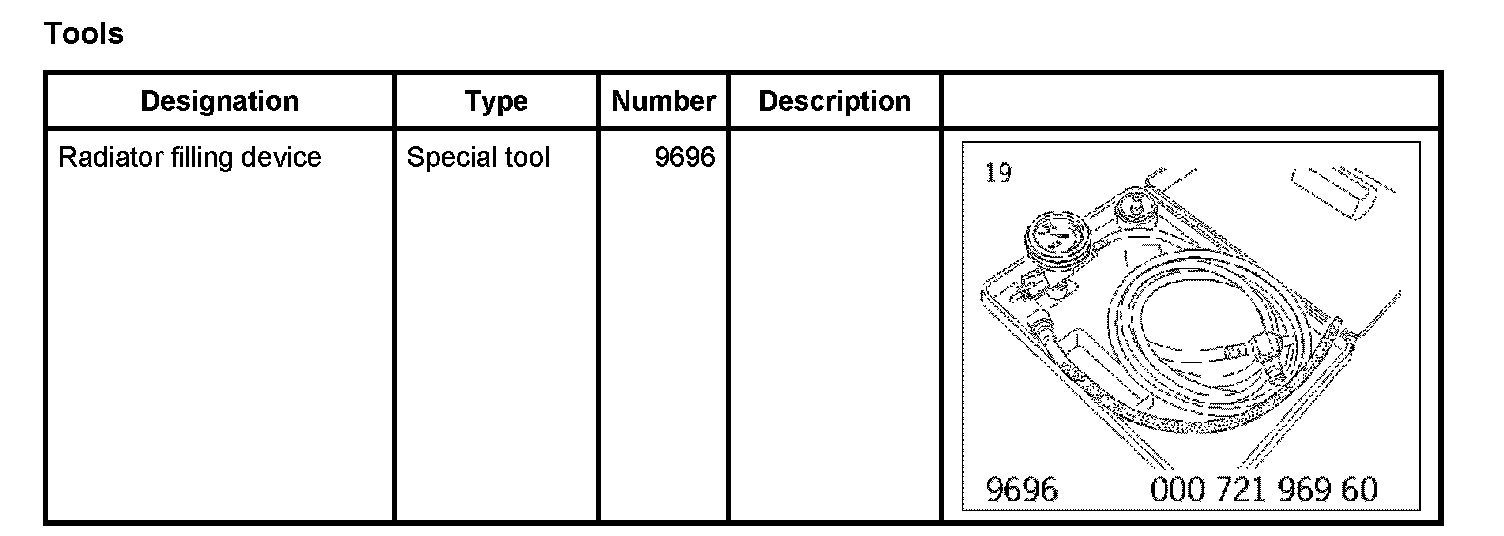 The process of filling and bleeding the cooling system continues to be performed using the special tool Radiator filling device 9696.