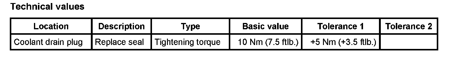 1. Fit new seals on drain plug and then tighten the drain plug. - Tightening torque: 10 Nm (7.5 ftlb.) +5 Nm (+3.5 ftlb.)