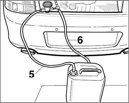 8. Push the filler hose of the vacuum pressure gauge -5- onto the canister connection. Draw off the return line -6- of the Venturi nozzle into a second container.