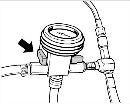 10. Open both shutoff valves on the vacuum pressure gauge until the transparent filler hose is completely filled with coolant.