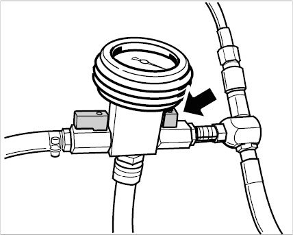 13. Open the left-hand shutoff valve on the vacuum pressure gauge (right-hand valve closed -Arrow-). The cooling system is then filled.