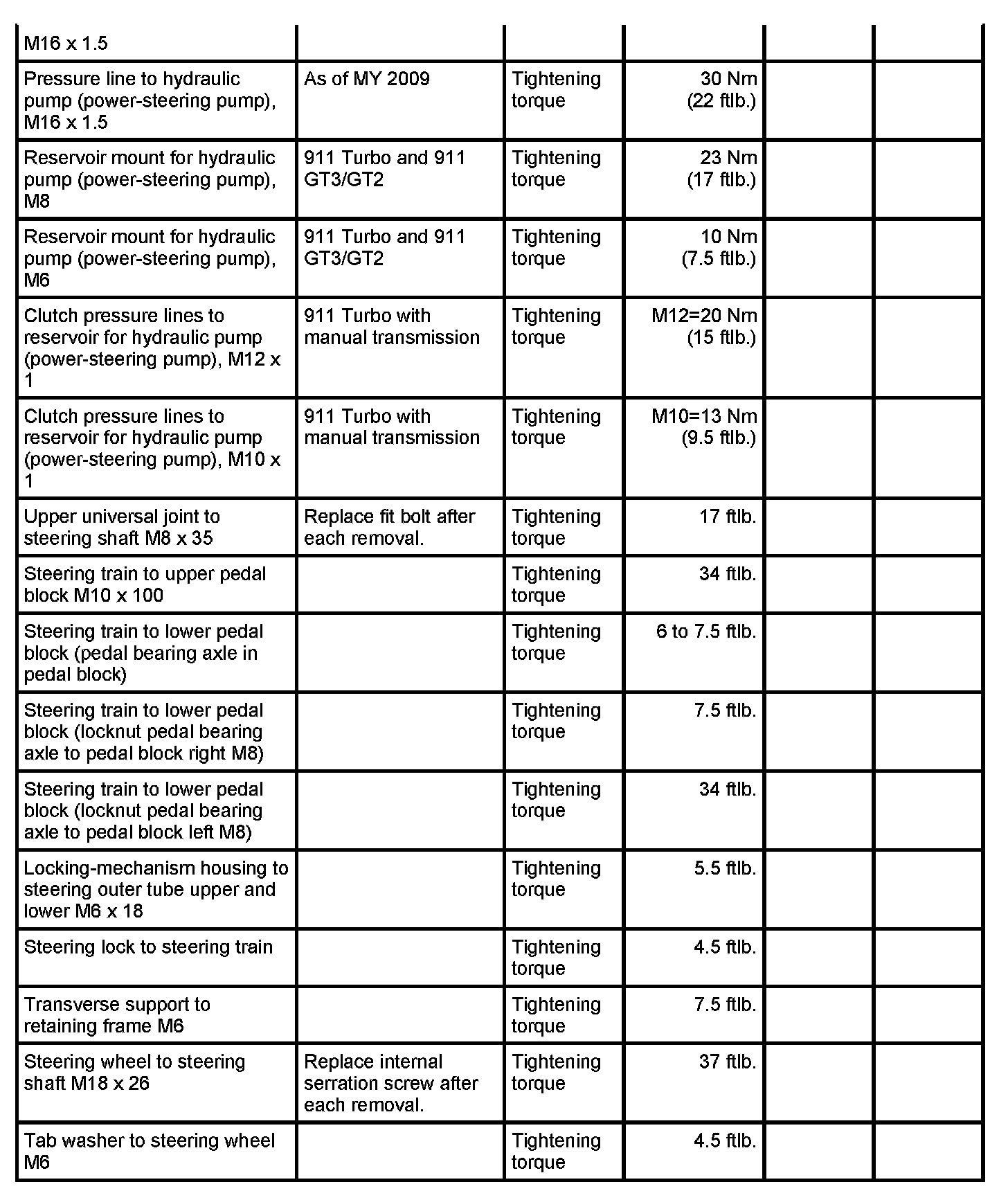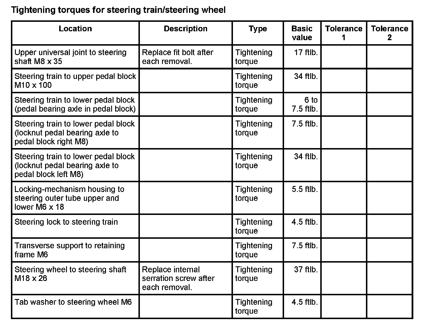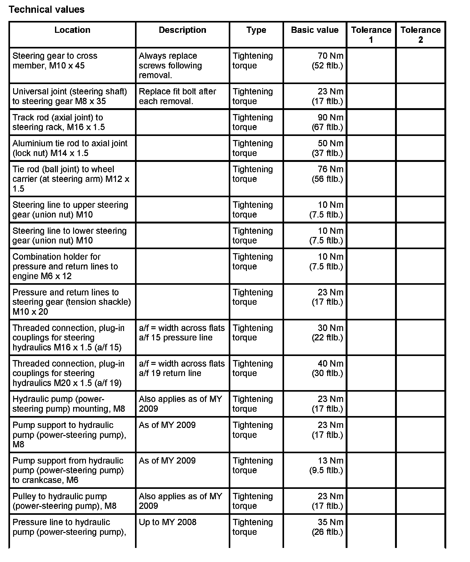 Tightening torques for