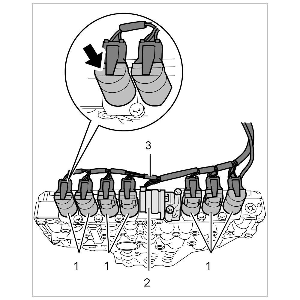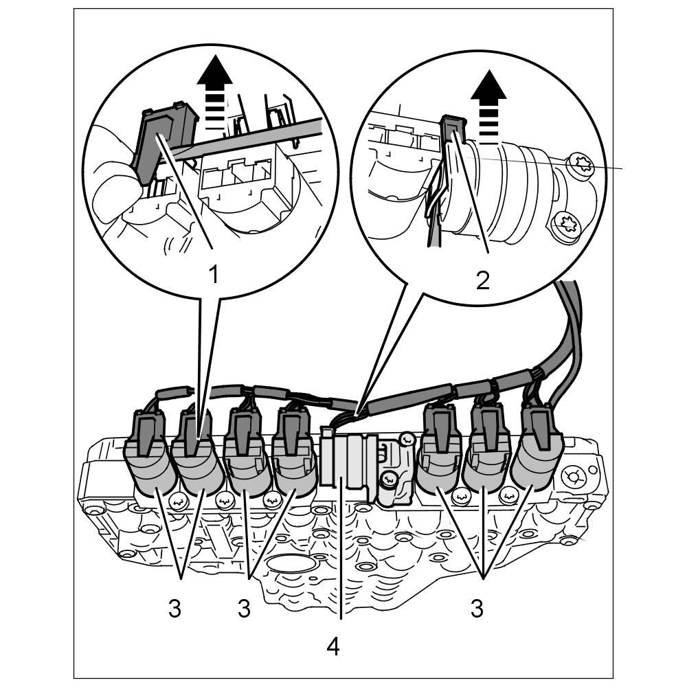 The wire harness for the solenoid valves -3- and the cable for the temperature sensor -4- must be routed in the recess between the transmission housing -2- and electrohydraulic control unit -1- because otherwise the cables can become squashed, resulting in damage and malfunctions.
