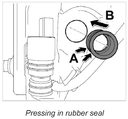 1. Apply a suitable rubber lubricant (tyre mounting paste) to the sealing surface -arrows A- and press the rubber seal into the tank -arrow B- until it is felt to engage.