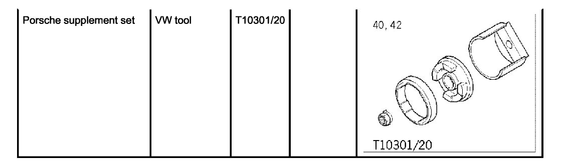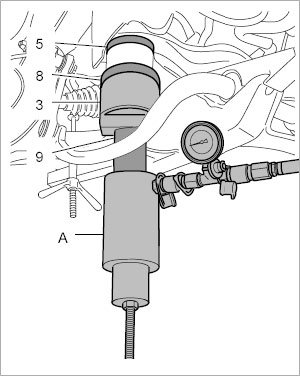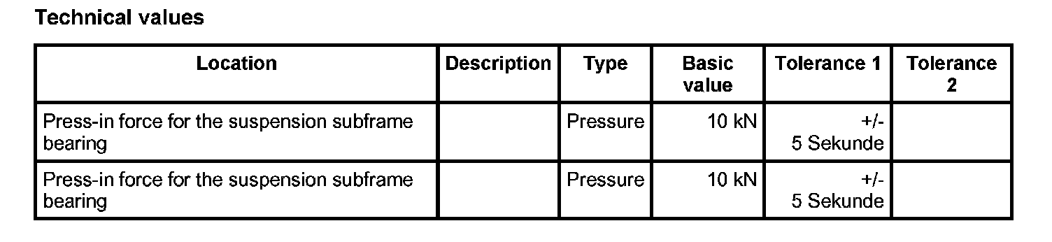 5. Press in suspension subframe bearing. To avoid damaging the bearing, the maximum -> Pressure: 10 kN±5 Sekunde must not be exceeded at the stop (10 KN = 350 bar). This conversion applies only to the hydraulic cylinder VAS 6178. The conversion depends on the diameter of the cylinder in question.