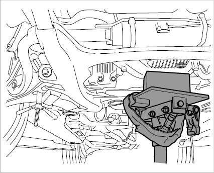 4. Loosen the suspension subframe bearing on both sides, carefully lower the gear support (loosen the spindle carefully at the same time) until you get the clearance needed for using the press-out tool.