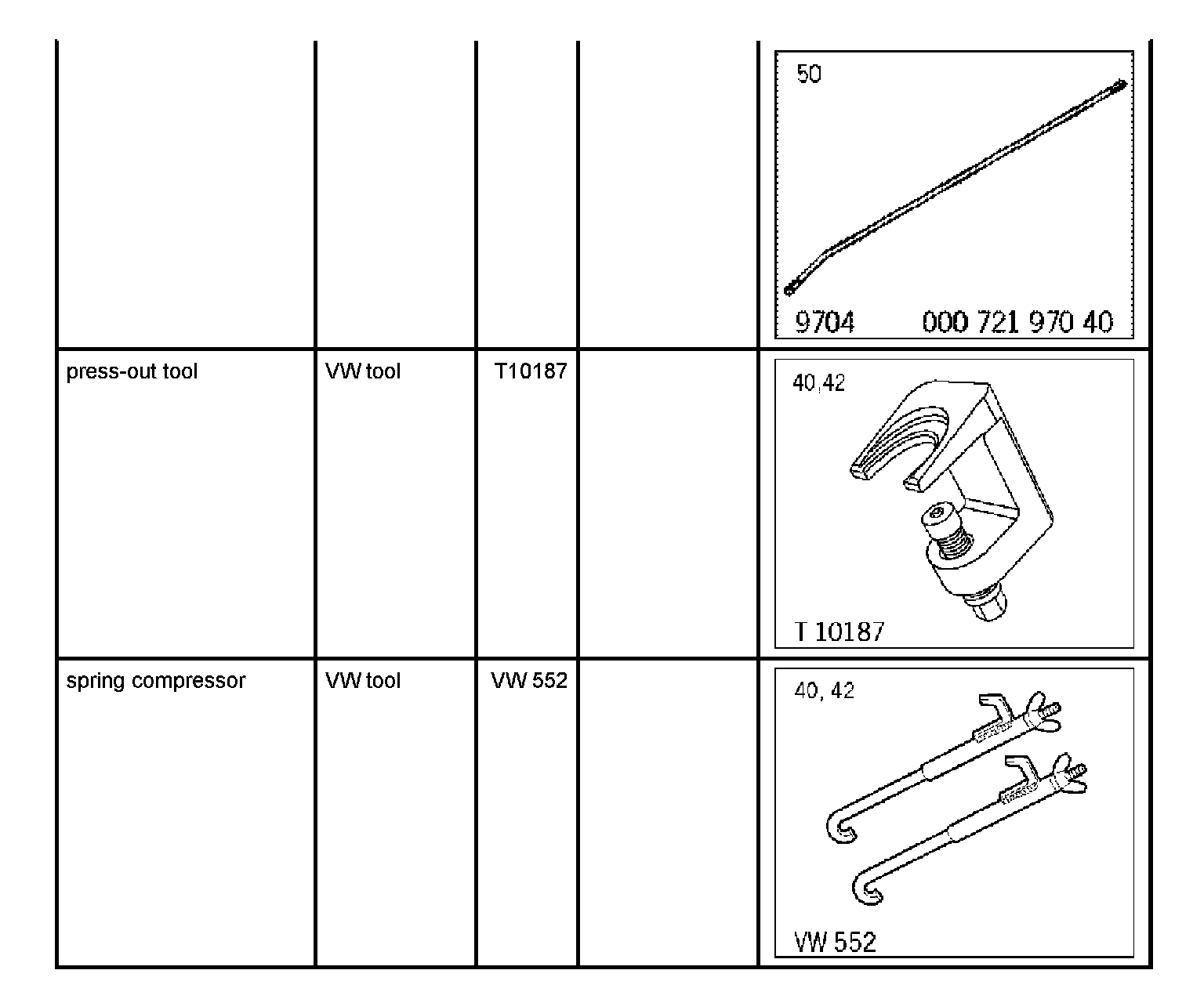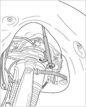 7. Fix upper axle struts with spring compressor VW 552. This involves tensioning the axle strut slightly because otherwise the top ball joint can be damaged. When doing this, engage the -connecting piece- into the top opening of the wheel well (double panel, under the wheel housing cover) and into the axle strut (do not disconnect the air spring connection!).