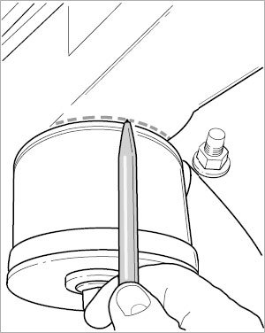 ^ For installation, it is a good idea to mark the installation position of the front axle carrier diagonally at at least two places on the body. To do this, place the marks vertically with respect to the floor of the body using a felt-tip pen (e.g. mark along the front-axle carrier mount with the pen).