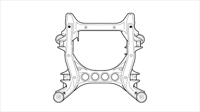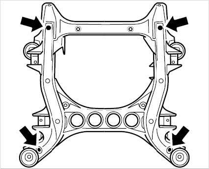^ The mounting points for the front axle carrier (1 and 3), both right and left, and the two positioning guides (4) that are pushed into the body are required for removing the front axle carrier. The other mounting points can be removed.