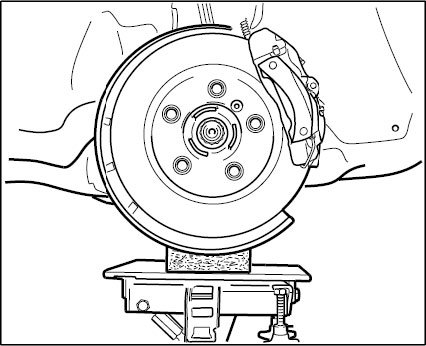 ^ Do not raise the wheel suspension higher than the normal vehicle position (vehicle resting on wheels). When raising the suspension, use a suitable -intermediate layer (hard rubber)-. Do not damage the brake cover plate.