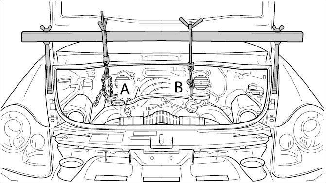 11. Remove the safety device 10-222 A. To do this, remove the transport eyebolt 9700 -B- and the chain -A-, which is used to secure the engine.