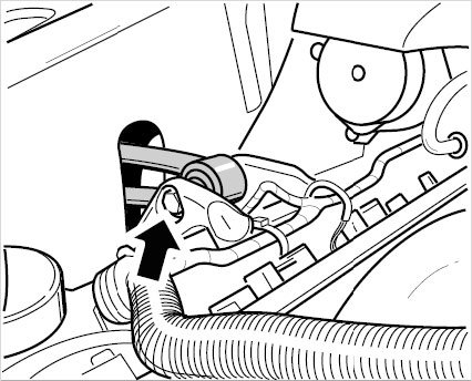 9. The screw in the steering shaft is removed from the wheel well. Release the coolant hoses from the holders on the body. Release the -steering column screw (arrow)- from the steering gear.