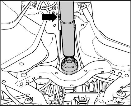 14. Loosen the rear axle housing (-arrows-). Lower the rear axle while taking care not to damage adjacent components.