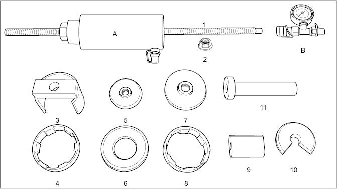 -A- - -> Hydraulic cylinder VAS 6178 (The hydraulic cylinder is used together with the -> foot pump VAS 6179 and the -> pressure gauge with connecting cable VAS 6179/1 -B-.)
